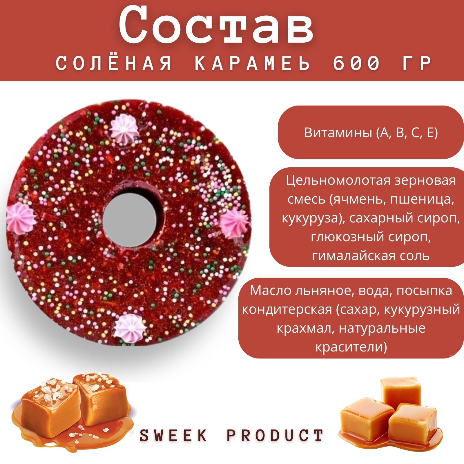 Цельномолотая зерновая смесь (ячмень, пшеница, кукуруза), сахарный сироп, глюкозный сироп, витамины (А, В, С, Е), масло льняное, соль гималайская, вода, посыпка кондитерская (сахар, кукурузный крахмал, натуральные красители).