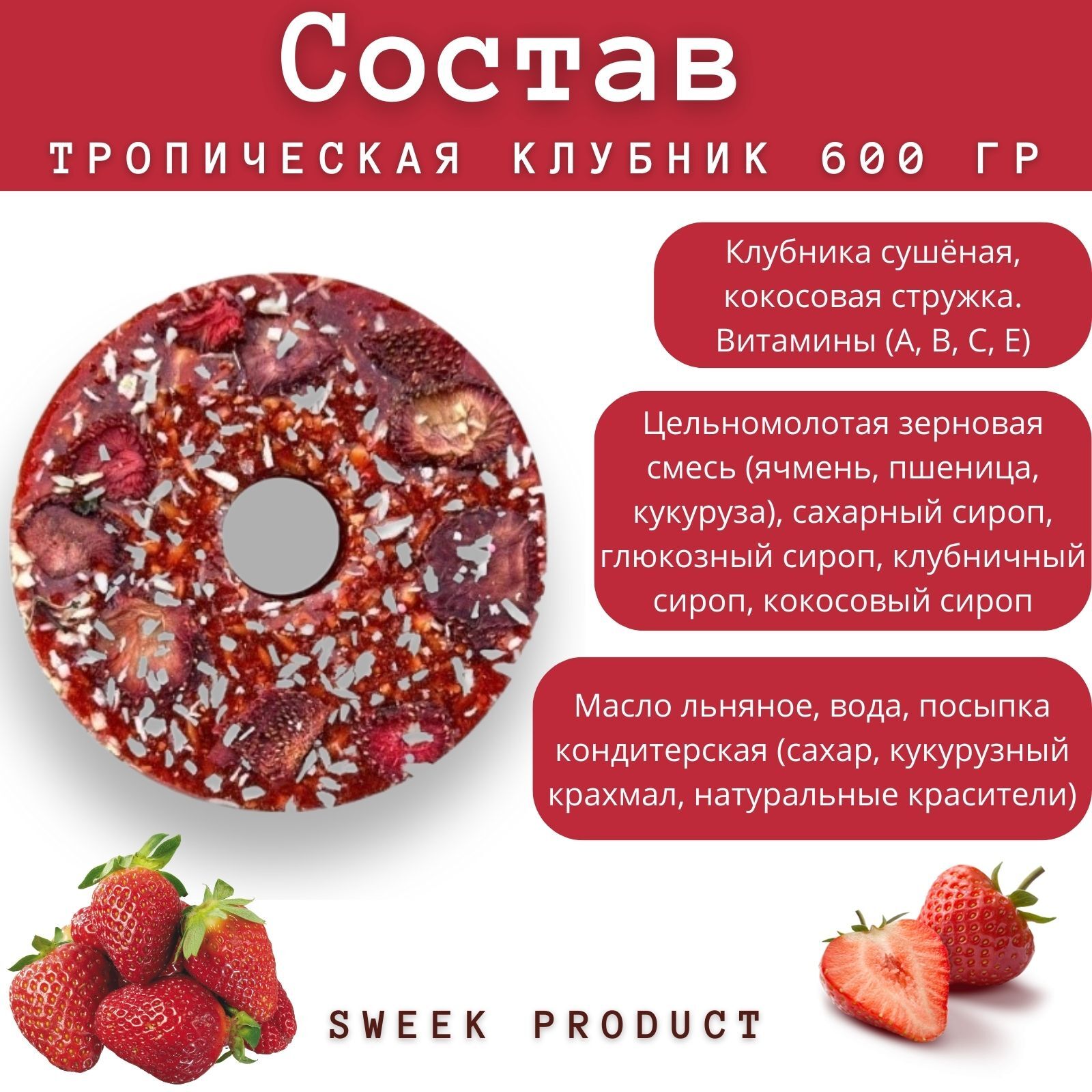 Цельномолотая зерновая смесь (ячмень, пшеница, кукуруза), сахарный сироп, глюкозный сироп, клубничный сироп, кокосовый сироп, клубника сушеная, кокосовая стружка, витамины (А, В, С, Е), масло льняное, вода, посыпка кондитерская (сахар, кукурузный крахмал, натуральные красители).