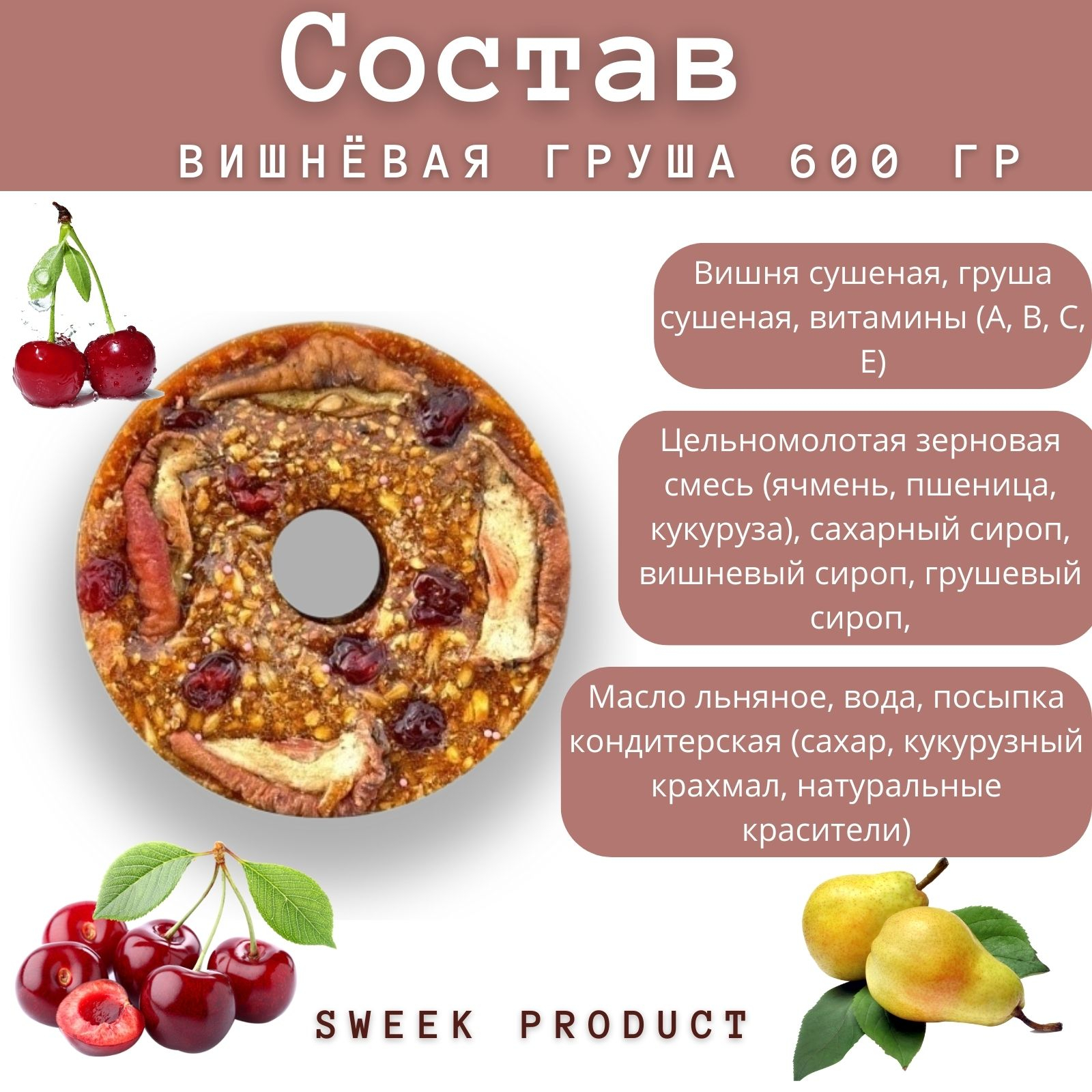 Цельномолотая зерновая смесь (ячмень, пшеница, кукуруза), сахарный сироп, вишневый сироп, грушевый сироп, вишня сушеная, груша сушеная, витамины (А, В, С, Е), масло льняное, вода, посыпка кондитерская (сахар, кукурузный крахмал, натуральные красители).
